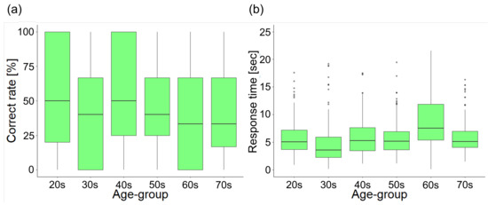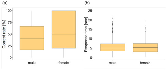 The ages of participants in this experiment varied, and there might have been some differences in the responses by gender. Therefore, we checked whether there were differences by the characteristics of participants, such as age group and gender, in the correct rate and response time. The box–whisker plot showing the relationship between age group and correct rate is presented in Figure 13a, and that between age group and response time in Figure 13b. In addition, the box–whisker plot showing the relationship between gender and correct rate is shown in Figure 14a, and that between gender and response time in Figure 14b.