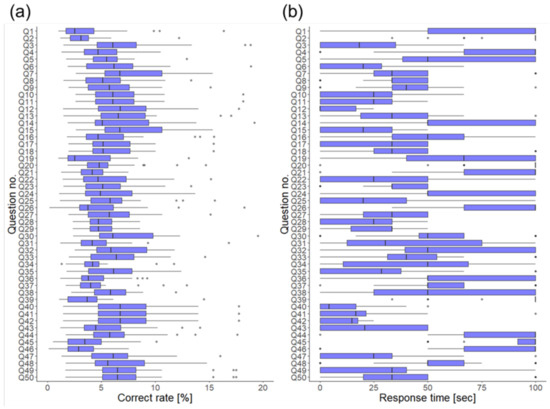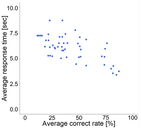 Figure 15a,b suggest that the shorter the response time, the higher the percentage of correct responses. The relationship between the average time to respond to each question and the average percentage of correct answers for each question is shown in Figure 16. The correlation coefficient between the two was ; thus, the two were inversely related. Therefore, considering the variation in the difficulty level of the questions created by the application described in this paper, it can be concluded that difficult questions with a low percentage of correct answers tend to require a longer time for response, while easy questions with a high percentage of correct answers tend to be answered quickly and intuitively.