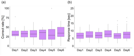 Similarly, a box-and-whisker diagram showing the relationship between the training day and response time for each question is shown in Figure 17b. An ANOVA was performed on the number of days since the start of training and response time, and it was found that there was no significant difference between the number of days and response time (), indicating that there was no relationship between the number of training days and response time.