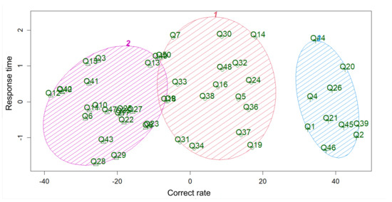 Next, a cluster analysis was conducted to extract the characteristics of the questions. First, the average answer rate and average response time for each question were analyzed. The NbClust function in the NbClust package was used for the cluster analysis. The NbClust package is an R package, and the NbClust function determines the number of clusters by majority vote after calculations using multiple selection methods, such as the gap statistic and the elbow method. The adequate category number for the question was determined to be three based on the result of NbClust, and the categorized data are shown in Figure 18. Here, the component 1 axis represents the answer rate and the component 2 axis the response time. Thus, the lower right region indicates questions that were easy to answer, whereas the upper left region indicates those difficult to answer.