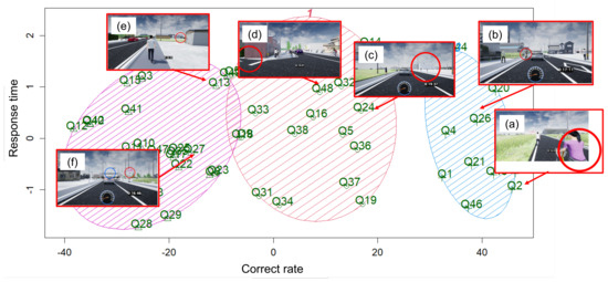 The characteristic questions were overlaid on the clusters obtained in Figure 18: (a) questions to make him/her aware of evacuated bicycles coming from behind him/her, (b) questions to notice pedestrians ahead crossing between cars, (c) questions to remind about distant hospitals, (d) questions to pay attention to a vehicle ignoring a stop sign and entering the area, (e) questions to note the flow of people in the distance and toward the evacuation route, and (f) questions to enhance awareness of landmark signs and traffic signals ahead.