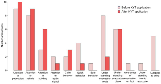 We developed the “Tsunami Evacuation Training Application” for continuous tsunami evacuation training. In this study, the training period using the “Tsunami Evacuation Training Application” was set to 6 days, but the validity of this period was not verified. The purpose of the “Tsunami Evacuation Training Application” is to help people become more attentive during evacuations by using the knowledge of actual tsunami evacuees. The results for the question “What do you think you should notice considering an evacuation from a tsunami?”, before and after training with the “Tsunami Evacuation Training Application” are shown in Figure 20. Note that the numbers in Figure 20 are those of stated responses to each item. From Figure 20, there is a tendency for participants to notice persons, vehicles, and buildings during an evacuation like actual tsunami evacuees. However, given that there were 25 people who participated in the experiment, less than half of the respondents indicated that this was the case. This may be attributed in part to an inadequate problem setup. In fact, Figure 12 shows that many people commented that the question was not fully understandable. Therefore, it is necessary to devise a more understandable and effective way of setting up questions for instruction.
