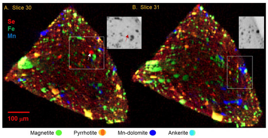 Pink-beam tomographic characterization of a fragment of sample C0034. Main images are false-color composite maps of reconstructed tomographic slices number 30 (A) and 31 (B), indicating XRF intensities for Se in red, Fe in green, and Mn in blue (all with independent intensity scales); yellow to orange spots have both Fe and Se; green spots are Fe without Se or Mn; blue spots are Mn with little or no Fe; turquoise-colored (blue + green) spots show the presence of both Fe and Mn. Shading differences from the outside to the center are due to absorption effects. See text for explanation of phase assignments shown in the legend. The 3-D voxel size is 4 × 4 μm in the plane of the slice × 1 μm thick. This is sufficient to distinguish the larger grains but not the fine-grained matrix. Insets: The outlined portions of each tomographic slice are shown in grayscale absorption contrast, which is a function of effective z-density. Darker voxels indicate higher absorption by such phases as metal oxides and sulfides. Silicates, phosphates, and carbonates are lighter, depending on what metals are in their composition, and organics and C phases are virtually transparent to hard X-rays. The arrows in (A) call attention to a grain that has high Se but no Fe or Mn, and the inset exhibits a low/intermediate absorption. The inset area in (B) highlights a composite carbonate grain, with a small high-Fe carbonate apparently overgrown by a low-Fe Mn-bearing carbonate.