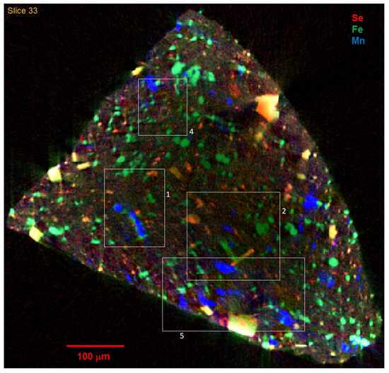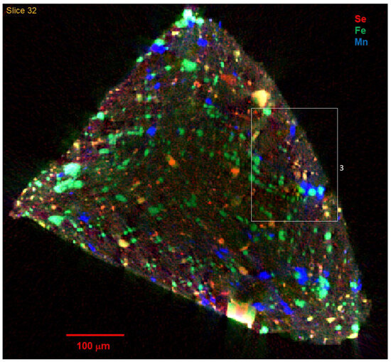 High-resolution tomographic slice number 32, voxel size 2 × 2 × 1 μm and showing Se (red), Fe (green), and Mn (blue). Outlined area 3 is shown in more detail in Figure 5.