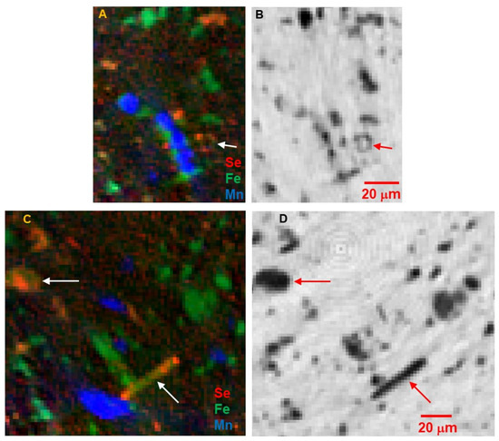 Close-up views of areas marked in Figure 2. (A) Area 1 from virtual slice 33, showing Se, Fe, and Mn in red, green, and blue, respectively, as in Figure 2. (B) Corresponding absorption contrast map, showing relative absorption of components. Arrows in (A,B) indicate a feature that consists of small Fe + Se grains with high absorption forming a circular rim around a low-absorption low-Fe material. (C) Area 2 from virtual slice 33, showing Se, Fe, and Mn as in (A). (D) Corresponding absorption contrast image. Arrows in (C,D) point out a rod-like structure (actually a plate shape intersecting the plane of this slice) with high absorption, that is a composite of Fe and Fe + Se components, while the more rounded grain to the upper left is similarly a composite of those two components.