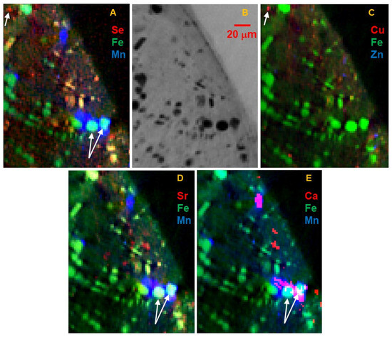 Close-up view of area 3 from virtual slice 32. (A) Se, Fe, and Mn as in Figure 3. (B) Corresponding image of absorption contrast. (C) Same area, depicting Cu in red, Fe in green, and Zn in blue. Arrows in the upper left of (A,C) mark a small grain that is high Cu and high Se but low Fe. There is only a scattering of small, low-signal spots with measurable Zn. (D) The same area, in this case depicting strontium (red), Fe (green), and Mn (blue). Note that the central areas of the Mn-bearing grains have a subtle purple to pink shading indicating the presence of trace Sr with the Mn. The two grains marked by arrows in the lower right of (A,D,E) exhibit a combination of Fe, Mn, and Sr. There are also some scattered very small red grains showing Sr without Mn or Fe. (E) The same area, showing Ca (red), Fe (green), and Mn (blue). Ca fluorescence is too low in energy for effective tomography, so it is only visible in the outermost ~40 μm of the sample, i.e., just along the edge. However, even that is sufficient to show here that the high-Mn grains are pink-purple colored and therefore contain significant Ca with the Mn. The two grains marked in (A,D) having both Mn and Fe also contain significant Ca. A number of small Ca-bearing grains appear red, indicating Ca without Mn or Fe. This distribution of Ca agrees with that of Sr in (D), confirming that Sr can be used to identify locations of Ca in the interior of the slice.