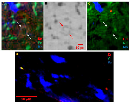 Close-up views of other areas marked in Figure 2. (A) Area 4 from virtual slice 33, showing Se, Fe, and Mn as in Figure 2. Arrows in (A–C) bracket a structure having a fine-grained rim of Fe + Se and some Fe around a low-Fe low-absorption area, a feature like the one in Figure 4A,B. (B) Corresponding image of absorption contrast. (C) The same area showing Cu (red), Ni (green), and Mn (blue). Ni is relatively low signal, distributed throughout the matrix but not in the large high-Fe grains prominent in (A), the Mn-bearing carbonates, nor in the interior of the round feature with the rim of Fe + Se grains. (D) Area 5, from virtual slice 33, depicting Zr (red), Y (green), and Mn (blue). Zr and Y are present in small, widely scattered hot spots; some of these have both Zr and Y, appearing yellow, and others consist of Zr without Y.