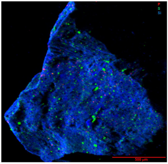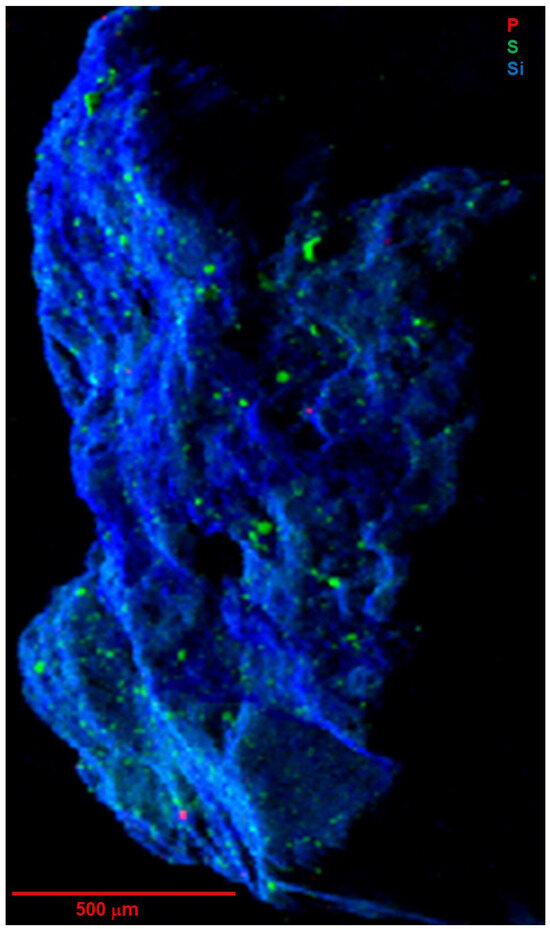 Tender-energy XRF map of whole-particle C0034, showing P, S, and Si as in Figure 7. Image was measured at the TES beamline with incident beam energy of 2.7 keV, beam focus size of 5 μm, and 5 μm pixel size.