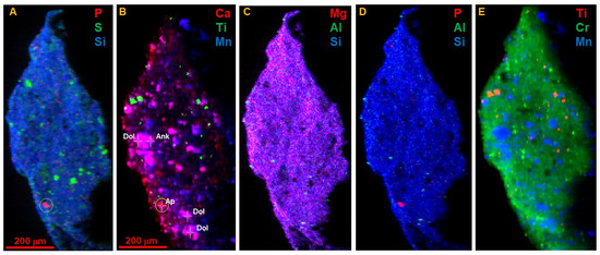 Tender-energy near-surface XRF maps of the smaller fragment of C0034 that was used for pink-beam FCT measurements. (A) Distributions of P in red, S in green, and Si in blue. (B) Corresponding map of Ca (red), Ti (green), and Mn (blue). This illustrates co-location of Ca and Mn; note that since sampling depth is greater for Mn than for Ca, grains buried below the surface may show Mn but not Ca signal. The grain marked with a circle is apatite, as it contains Ca but not Mn, and coincides with high P in (A). Locations marked were further probed using Ca K-edge XANES to identify phases apatite (Ap), dolomite (Dol), and ankerite (Ank). (C) Distributions of Mg (red), Al (green) and Si (blue). Al is concentrated in small spots, while Si and Mg are broadly distributed. (D) Distributions of P (red), Al (green), and Si (blue), more clearly showing the Al hot spots and the absence of Si in the carbonate and sulfide phases. (E) Distributions of Ti (red), Cr (green), and Mn (blue). Ti is present in discrete spots, while Cr is more broadly distributed at low concentration, with discrete higher concentration spots that are not correlated with Ti or Fe. Maps (A,C,D) were measured at the TES beamline with a probe beam energy of 2.7 keV, focused to 5 μm, and pixel size of 5 μm. Maps (B,E) were measured on the same mounted sample in the same orientation, at the XFM beamline with a beam energy of 7 keV, focus of 5 μm, and pixel size 4 μm.