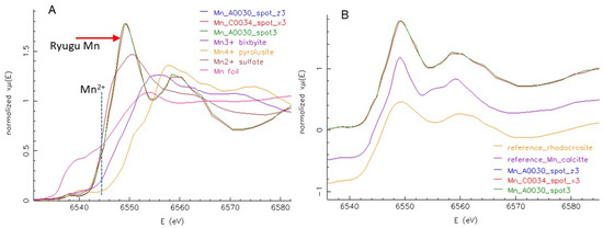 (A) Mn K-edge μXANES of three representative spots on the two Ryugu samples are compared to reference spectra for Mn foil, Mn2+ (sulfate), Mn3+ (bixbyite Mn2O3), and Mn4+ (pyrolusite, MnO2) (reference spectra from [12]). The absorption edge (initial rise) position in energy is characteristic of oxidation state and shows that Mn in these Ryugu grains is Mn2+ as marked by the vertical dotted line. (B) Closer examination of Mn μXANES: bottom spectrum is reference rhodochrosite, MnCO3 (Sweet Home Mine, Alma, Colorado, USA), which has two dominant peaks at 6548.5(1) eV and 6560.6(2) eV. Middle spectrum is trace Mn in calcite (Franklin, New Jersey, USA), which has corresponding peaks at 6549.1(2) eV and 6559.3(2) eV and an additional peak at 6555.0(6) eV. Top spectra are two spots on A0030 and one on C0034; these spectra closely match each other and display two peaks that are each split at 6549.1(1) eV with a shoulder at 6552.4(1.4), and at 6559.3(4) and 6564.2(1.4) eV. This structure is analogous to that observed in Ca μXANES of dolomite (Figure 11), corroborating a dolomite structure host.