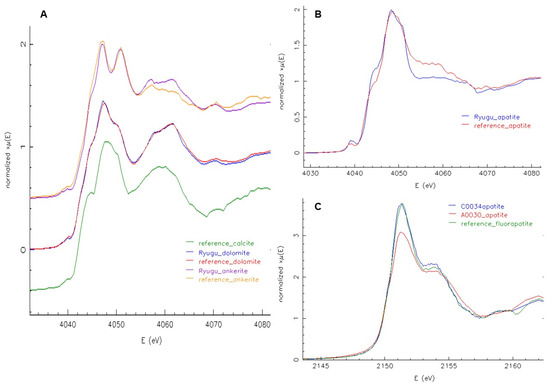 (A) Ca K-edge μXANES of several spots on C0034 (Figure 9B), identifying Ca-bearing minerals. The lower spectrum is reference calcite (sample from Brazil), which is dominated by peaks at 4048.0(1) eV with a shoulder at 4050.5(2) eV and 4059.1(1) eV. In dolomite, these spectral features are each split into two peaks at 4047.5(1) eV and 4050.6(1) eV, and 4057.1(4) eV and 4061.1(1) eV. The two middle spectra are that of reference dolomite (sample from Eugui, Spain) and closely match Ryugu C0034 dolomite with corresponding peak positions at 4047.4(1), 4050.6(1), 4057.1(3), and 4061.2(1) eV. In ankerite, there is wider separation of these spectral features, with component peaks at 4047.0(4), 4051.2(1), 4056.7(5), and 4061.6(2) eV. The upper two spectra compare reference ankerite (sample from Temagami, Canada) to ankerite in C0034, with peak positions at 4047.1(2), 4050.9(1), 4056.9(3), and 4061.8(1) eV. Details of spectral feature analyses are given in Supplementary Materials. (B) Ca μXANES of a different spot on C0034 (Figure 9B), one with coincident P fluorescence, matching the spectrum of reference apatite (Durango, Mexico). (C) In addition to the Ca XANES, phosphorus K-edge μXANES of representative spots on A0030 and C0034 match the P μXANES of the reference apatite.