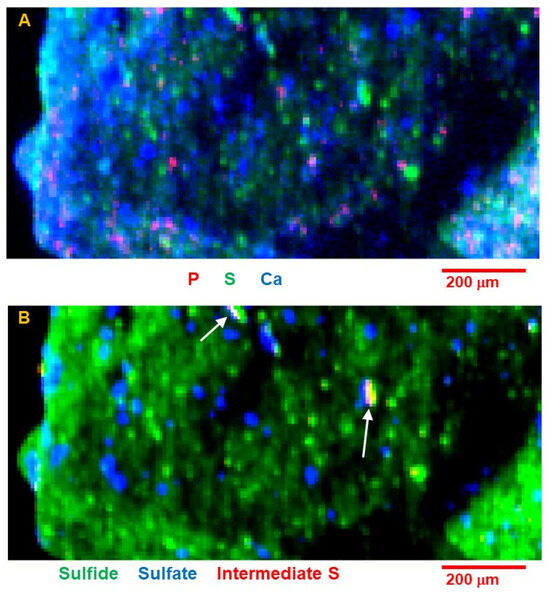 A different view of whole-particle C0034. (A) XRF map depicting P in red, S in green, and Ca in blue; blue spots indicate Ca-bearing carbonate, while pink-purple spots indicate Ca phosphate such as apatite. Some of the smaller P spots are P without Ca. (B) A sulfur speciation map derived from maps of the same area made at multiple energies to isolate sulfide (shown as green), sulfate (shown in blue), and an undetermined intermediate S species (shown in red and pointed out with arrows). Note that different S species are scaled independently: sulfide is at significantly higher concentration than sulfate or intermediate S. These maps were measured at the XFM beamline, with probe beam energy near 2.47 keV, beam focus of 5 μm, and pixel size of 8 μm.