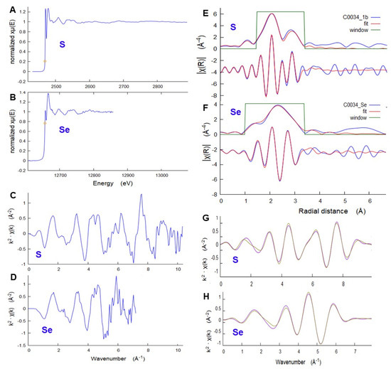 S and Se μEXAFS analyses. (A) A single scan of S in a sulfide grain in C0034, measured with a 5 μm beam spot at the TES beamline, showing EXAFS oscillations extending out beyond the XANES range. (B) Corresponding Se μEXAFS of the same sulfide grain, measured as the sum of six replicate scans using a 5 μm beam at the XFM beamline. Note that the length of Se scan was limited by experimental constraints. (C,D) Extracted EXAFS signal from the spectra in (A,B), plotted with k2 weight. (E) Fourier transform of this S EXAFS data vs. the corresponding fit to the pyrrhotite structure model. Upper plot is the radial distribution function magnitude, while the lower plot is the real component; measurement is shown in blue, fit in red. (F) Similar fit of Se data to the pyrrhotite model. (G,H) Back-transformed data (blue) and fit (red), for the range of R used in the fit, presented as k2-weighted plots demonstrating excellent fits for both S and Se. Fits to the pyrrhotite model include first-neighbor S-Fe (Se-Fe) and second-neighbor S-S (Se-S) distances.