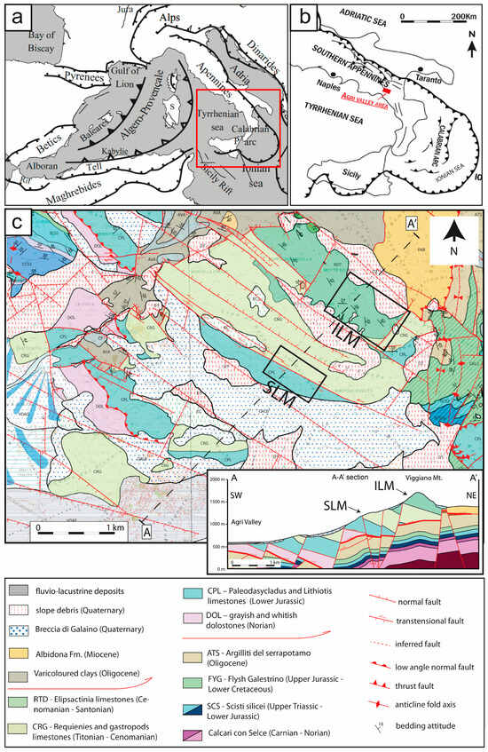 Geological map of the study area. (a) Regional overview of the study area. (b) Schematic map of the southern Apennine FTB, with the Agri Valley location and study area location. (c) Geological map of the Viggiano Mt. area [29], with the locations of the SLM (Scarrone la Macchia) and ILM (Il Monte) study sites and the NE-SW geological cross-section of the Viggiano Mt. area.
