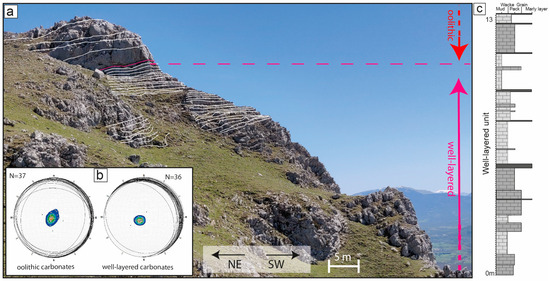 (a) Outcrop views of the SLM in which the well-layered and oolitic units are differentiated. (b) Bedding attitude of SLM. (c) Detailed stratigraphic log showing the facies texture of the well-layered unit of the SLM site.