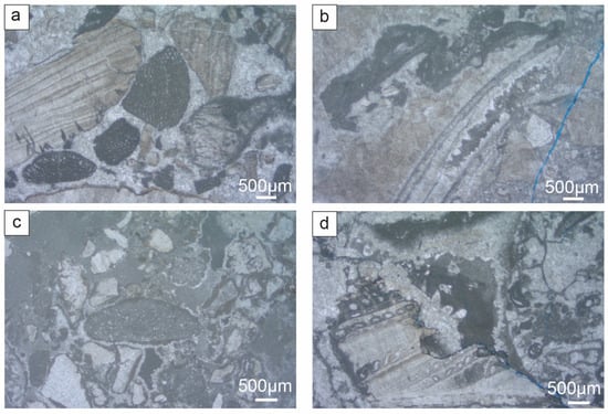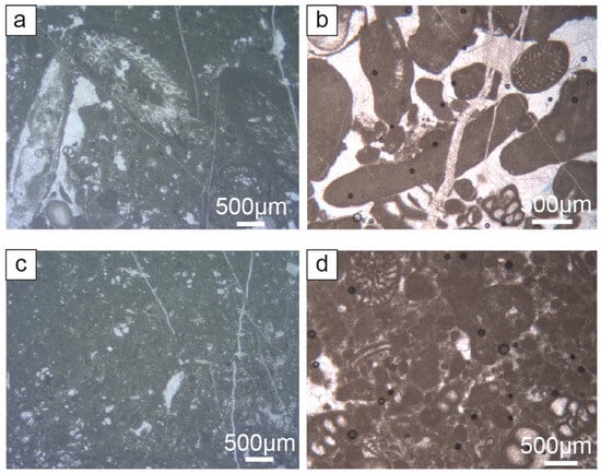 The exposed carbonates at the SLM site are sub-divided into two informal units [30] (Figure 2a,c). Starting from the base, the well-layered unit consists of about 13 m thick shallow-water limestone. There, three main facies are differentiated (Figure 2) as (a) algal grainstone/packstone characterized by abundant calcareous algae (Palaeodasycladus mediterraneus and Thaumatoporella parvovesiculifera) associated with benthic foraminifera (Figure 3a,b) (this facies is typical of a moderate-energy shallow marine lagoonal environment); (b) benthic foraminifera wackestone, characterized by an association of benthic foraminifera (including Haurania sp., Siphovalvulina sp., Lituosepta sp.) interpreted as a moderate- to low-energy lagoonal environment (Figure 3c,d); (c) marly layers.