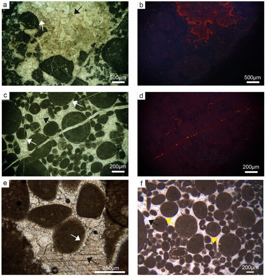 (a) Plain polarized light image of the well-layered unit showing radiaxial fibrous cements (white arrow) and blocky cements (black arrow). (b) Same image of (a) under CL. (c) Plain polarized light image of the oolitic unit showing isopachous cements (white arrow) and blocky cements (black arrow). (d) Same image of (c) under CL. (e) Plain polarized light image of a grain-supported facies in the well-layered unit showing isopachous cements (white arrow) and blocky cements (black arrow). (f) Plain polarized light image of the oolitic unit showing meniscus cements (yellow arrow) and blocky cements (black arrow).