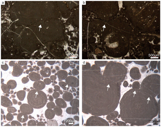 Topping the well-layered unit, the 17 m thick grain-supported unit consists of oolitic limestones (Figure 2a,c). The results of microfacies analyses show that it includes carbonate grainstone and packstone with ooids (0.5 to 1 mm in size), oncoids (>1 mm), and algal lumps. In some cases, the ooids show an obliteration of the laminae due to intense micritization. Their nuclei are made of skeletal grains, peloids, and, in rare cases, siliciclastic sand grains.