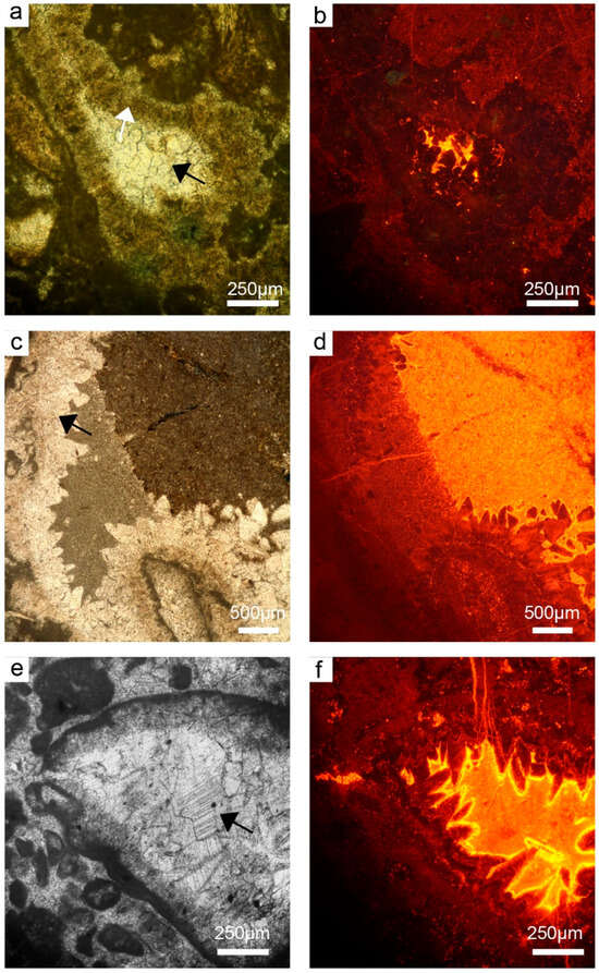 (a) Plain polarized light image showing the radiaxial fibrous cements (white arrow) and blocky cements (black arrow). (b) Same image of (a) under CL. (c) Plain polarized light image showing dog-tooth cements (black arrow) and sediment infill. (d) Same image of (c) under CL. (e) Polarized images showing blocky cements (black arrow). (f) Same image of (e) under CL.