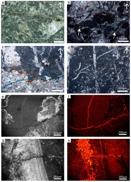 At the microscale, no grain contact seams are observed and the pressure solution features only include stylolites. The morphology of these stylolites is commonly rough. In the rudstone carbonate facies, they show tiny pinning teeth as high as a few tens of µm (Figure 10a,b). According to Koehn et al. [22], the stylolites are classified as a sharp-peak type. Differently, stylolites with teeth as high as 100–200 µm are documented within the floatstone carbonate facies (Figure 10c,d). Wave-like stylolites occur only in the carbonate facies, including micrite (Figure 10e). The stylolites dissolve skeletal fragments, carbonate grains (Figure 10a), calcite cements (Figure 10b,c), and WSW-ENE striking high-angle veins (Figure 10d). The stylolites contain a residual reddish-brownish material, and/or are partially open (Figure 10e,g). Occasionally, under CL the residual sediment appears bright luminescent (Figure 10f).