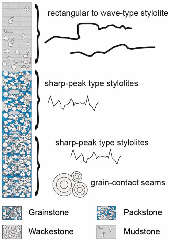 Within shallow-water carbonates, diagenetic processes such as physical and chemical compaction, cement precipitation, and microfracturing have a profound effect on their composition, texture, porosity, and overall petrophysical properties [1,2,3,4,5]. Focusing on chemical compaction, according to the classification of pressure solution features first proposed by Choquette and Pray [6], two main types of stylolites and pressure solution seams can be distinguished, e.g., (i) non-sutured solution surfaces, which can occur either as single seams or as swarms and often form within carbonates that include a significant content of insoluble material such as clay, silt, and/or organic matter; (ii) sutured solution surfaces, which correspond to stylolites and grain contact sutures and often form within carbonates with a low content of insoluble residual material.