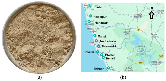 Soil samples were collected from different locations along the coastal belt of the Uttara Kannada region to represent the full range of lithomargic clay properties. The sampling sites, illustrated in Figure 1b, included Shiroor, Behalli, Bhatkala, Shirali, Ternamakki, Tumbebeela, Manki, Honnavar, Haladipur and Kumta. The collection of undisturbed soil samples was carried out using the core cutter method in accordance with IS: 2720 (Part 29) 1975 [19,20,21,22,23]. For laboratory experiments on the soil to determine mineralogical and geotechnical properties, disturbed samples were gathered in bulk quantities and placed in plastic bags. Subsequently, the collected disturbed samples were pulverized, thoroughly mixed, air-dried and subjected to oven drying at 105 °C before being stored in plastic bags. Figure 1a shows the typical lithomargic clay sample from the Shiroor location.