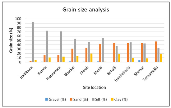 Figure 2 provides the composition data for different locations based on gravel, sand, silt and clay percentages. Notably, Shiroor sample has the highest gravel content at 4.07%, with sand at 44.2%, silt at 42.94% and clay at 8.79%. Ternamakki exhibits the lowest gravel content (0.14%) but higher percentages of sand (47.73%) and clay (19.22%). Generally, locations such as Manki and Tumbebeela have substantial sand content, while Behalli and Shirali show higher proportions of silt and clay. Understanding these soil compositions is essential for various construction and engineering applications in each location. In Figure 2, a clear pattern of increasing sand content with decreasing silt content can be observed.