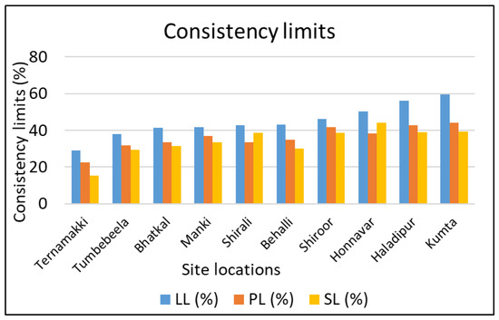 The liquid limit test is conducted using the Casagrande apparatus. In Figure 3, it can be observed that Kumta has the highest liquid limit (LL) of 59.5%, indicating that a higher moisture content is needed to change its state from plastic to liquid. Ternamakki has the lowest LL (29.1%). Honnavar has the highest plastic limit (PL) of 38.43%, indicating the moisture content at which the soil transitions from plastic to semisolid. Ternamakki has the lowest PL (22.34%). Kumta has the highest plasticity index (PI) of 15.41%, reflecting its overall plasticity and susceptibility to changes in moisture. Ternamakki has the lowest PI (6.76%). Honnavar and Kumta share the highest shrinkage limit (SL) of 44.01% and 39.36%, respectively, indicating the point at which the soil no longer shrinks further upon drying. Ternamakki has the lowest SL of 15.39%. With the growing liquid limit, it is evident that the shrinkage limit, plasticity index and plastic limit are all trending upward. As per IS classification, soil samples from Bhatkal, Shirali, Manki, Tumbebeela, Shiroor and Shirali are categorized as MI, which denotes medium-plastic inorganic silts. The Ternamakki sample falls within the ML category, which denotes inorganic silts with little to no plasticity. Soil samples from Honnavar, Haladipur and Kumta are categorized as MH, which denotes high-compressibility inorganic silt. Minerals such as calcium carbonate (calcite), iron oxides or aluminum oxides are observed to be relatively higher in the Kumta, Haladipur and Honnavar samples, which can act as natural cementing agents. These agents may enhance cohesion and contribute to higher LL and PL values. The Honnavar sample has a relatively higher proportion of montmorillonite; the Haladipur sample has a higher content of illite and calcite; and the Kumta sample has relatively higher proportions of illite, montmorillonite and vermiculite. These minerals in silt and clay contribute to an increase in liquid limits and plastic limits.