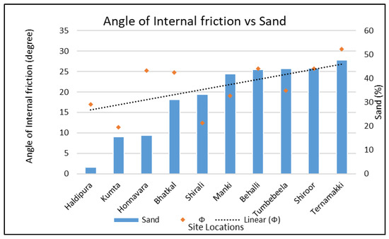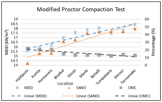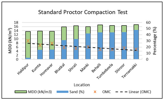 An ascending trend is observed in the MDD values of the modified Proctor test with the increase in values of sand content, as shown in Figure 5. The sample from Haladipur showed a lower value of 15.59 kN/m3 with a sand content of 2.67%. The MDD value depicts an ascending trend in various locations with the rise in sand content. The Ternamakki sample depicts the highest MDD value of 18.44 kN/m3 with a sand content of 47.73%. The optimum moisture content decreases with an increase in the proportion of sand content, as shown in Figure 5.
