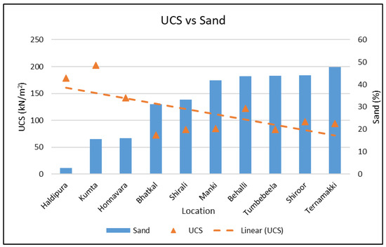 In Figure 6, the UCS values also show variability, with the lowest value of 72.9 for Bhatkal and the highest value of 202.43 for Kumta. The higher UCS values for the Kumta and Haladipur samples may be due to those areas having relatively lower amounts of sand and higher amounts of silt and clay in the soil. Samples such as Tumbebeela and Shiroor have similar sand content, but their UCS values differ, suggesting that other factors also influence the compressive strength. Gibbsite and muscovite are minerals commonly associated with lower unconfined compressive strength (UCS) in the soils of Shiroor, Ternamakki and Tumbebeela. Gibbsite—an aluminum hydroxide mineral—contributes to lower UCS values due to its softness, low cohesion and high porosity. Similarly, muscovite—a phyllosilicate mineral with a platy structure—exhibits reduced cohesion, lower shear strength and looser particle arrangement, all contributing to soil’s diminished compressive strength [24]. It is important to note that the overall geotechnical behavior of soils is complex and influenced by a combination of minerals, their proportions and particle characteristics.