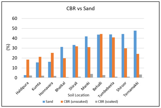 It is evident in Figure 7 that the unsoaked CBR value demonstrates an increasing trend from 18.30% to 44.20% with an increase in sand content up to 43.68% in the Behalli sample. The soaked CBR values vary from a value of 0.7% for the Bhatkal sample to a maximum value of 3.9% for the Manki sample. Ternamakki and Manki experience a notable increase in CBR when soaked, suggesting relatively good strength and load-bearing capacity in saturated conditions. The Bhatkal soil undergoes a substantial reduction in CBR when soaked, suggesting potential challenges in maintaining stability and load-bearing capacity in wet conditions. Most of the minerals identified among all the locations with a plate-like structure can result in lower shear strength and compaction characteristics, especially when they come in contact with water, which may lead to decreased soaked CBR values [24]. Montmorillonite has a high cation-exchange capacity and can undergo significant volume changes with variations in water content, leading to reduced shear strength and compaction characteristics. Soil with a significant presence of montmorillonite may exhibit lower CBR values due to the mineral’s influence on the soil’s mechanical properties.