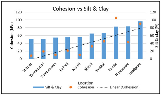 The Manki and Shiroor soils, while possessing high silt content, lack significant clay, and their moderate cohesion values require a careful engineering assessment for construction. High cohesion (32.25 kPa) suggests significant shear strength. The Shirali and Kumta soils have high cohesion values with balanced silt and clay content indicating potential stability in construction, but they may require specific engineering measures due to the high silt and clay content, as depicted in Figure 9. The plate-like structures of minerals and high water content can result in lower shear strength and friction angle, making soils with a significant presence of muscovite, vermiculite, montmorillonite susceptible to shear deformation.