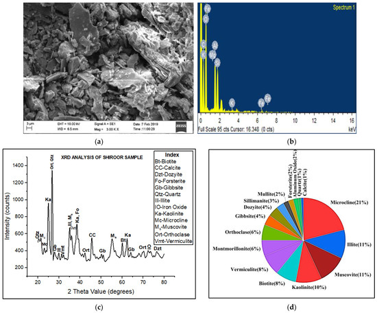 The EDS analysis and SEM analysis are used to confirm the mineral compounds observed through XRD analysis. Typical XRD, EDS and SEM analyses of the Shiroor sample are shown in Figure 10. Figure 10a presents SEM images of sheet minerals, such as vermiculite or biotite, as EDS analyses (Figure 10b) to confirm the presence of magnesium with potassium, alumina and silica. Figure 10c,d show the identified minerals present in the Shiroor sample and their quantifications, respectively [25].