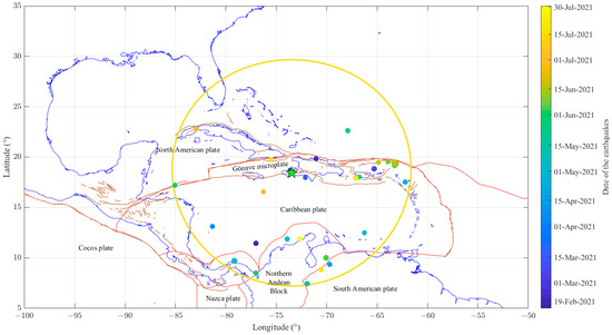 Geographical and tectonic context of the Mw = 7.2 Haiti 14 August 2021 earthquake. The epicentre is shown as a green star. The yellow circle depicts Dobrovoslky’s area. Blue lines represent the coasts, brown lines represent the active faults (shown only for the Central American and Caribbean regions) and red lines represent the plate borders. Earthquakes of magnitude equal to or greater than 4.2 with a maximum depth of 50 km that occurred in the six months before the Haiti in the Dobrovolsky have been visualised as a filled dot with size proportional to their magnitude and colour to their origin time.