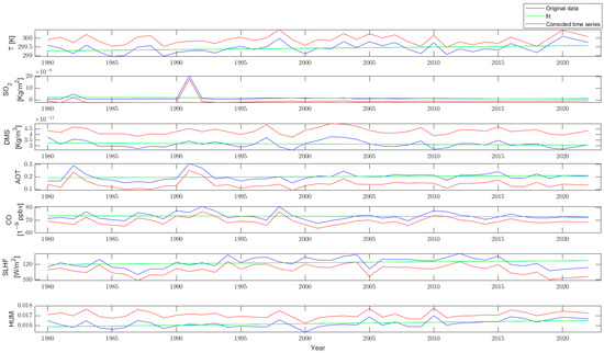The atmosphere has been investigated using the climatological archive MERRA-2 provided by NASA with data from 1980 to the present [82]. The dataset is based on real observation from the ground and remote sensing (satellites, airborne, aviation, etc.), constituting the input of a chemical–physical model of the atmosphere with a space resolution of 0.625° longitude, 0.5° latitude and 1 h of time resolution. The analysis has been conducted with the “MErra-2 ANalysis to search Seismic precursors” (MEANS) algorithm developed for the first time to study volcano eruptions and subsequently applied to several earthquakes [69,71,72,83] and, recently, La Palma 2021 volcano eruption [84]. Some improvements to the method have been applied over the years. The selected version was previously used to analyse the Lushan (China) 2013 earthquake [69]. In particular, global warming is removed from all the parameters as a linear fit shown in Figure 2. It is interesting to note that SO2 showed a high peak in 1991 due to Pinatubo’s great volcano eruption (Volcano Explosive Index = 6).