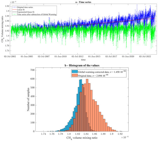 Regarding methane, data was directly acquired by the Atmospheric INfrared Sounder (AIRS) dataset of the AQUA satellite. For the first time in this approach, the version 7.0 dataset has been explored instead of version 6.0. For this reason, Appendix A shows the analysis of the previous version, 6.0, for comparison. In particular, the whole time series of the available values at a maximum distance of 3.0° from the epicentre from 2002 up to 2023 has been shown in Figure 3a. A linear fit and an “exponential–linear” one were calculated and overplotted on the time series. The data were normalised, removing the exponential–linear fit but maintaining the same absolute value. The histogram of the distribution of the values before and after the detrending is plotted in Figure 3b. It is possible to note that the dispersion of the values was reduced after detrending them as expected. The multi-year trend is likely due to global warming produced by increased methane concentration in the atmosphere.