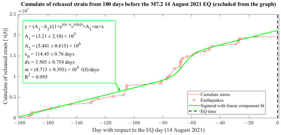 Cumulative seismic stress calculated with earthquakes in Dobrovolsky’s area and with a magnitude equal to or greater than completeness magnitude 4.3. The fit is shown as a green line, and its coefficients are presented in the box inside the figure (days in the box are counted from 0 to 180 days, in particular, x0 = −65.03 in days with respect to the earthquake day).