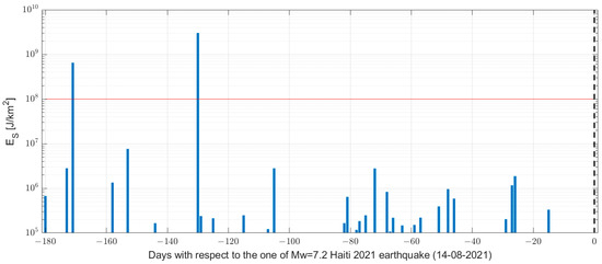 Daily seismicity analysis made by the daily ES parameter (shown as blue bars). According to the previous literature, the red line represents the threshold to consider active the region on a specific day. The dashed black vertical line indicates the day of Mw = 7.2 Haiti 2021 earthquake.