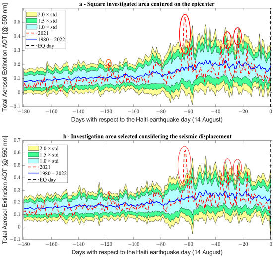 Aerosol investigation in the six months before the Haiti 2021 earthquake (vertical dashed black line) using (a) a symmetric square area centred on the epicentre or (b) a rectangular area around the seismic displacement. The years 1980 (only a), 1991, 2015 and 2020 have been excluded for outlier values. Red circles underline anomalies in the lower panel and the one in the upper panel, confirmed by investigations in both areas, while orange circles underline anomalies in the upper panel only.