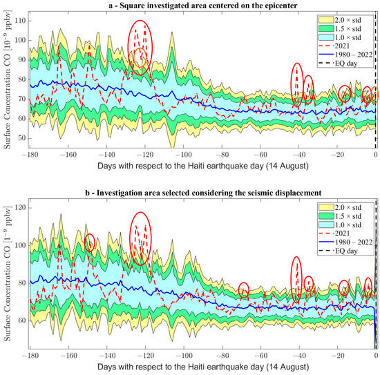 Carbon monoxide (CO) investigation in the six months before the Haiti 2021 earthquake (vertical dashed black line) using (a) a symmetric square area centred on the epicentre or (b) a rectangular area around the seismic displacement. The years 1981, 1982, 1983, 1989, 1992 (only b) and 1998 have been excluded for outlier values. Red circles underline anomalies in the lower panel and the one in the upper panel, confirmed by investigations in both areas, while orange circles underline anomalies in the upper panel only.