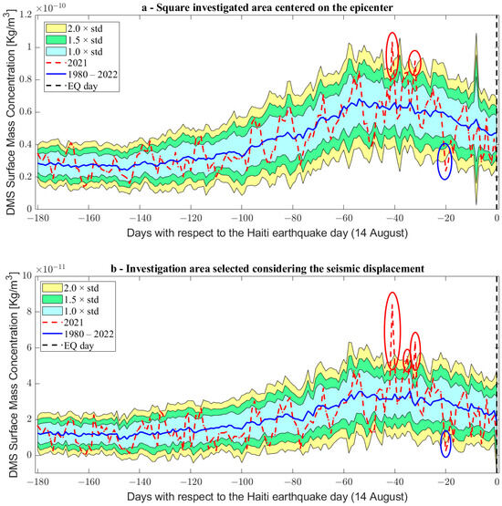 Dimethyl sulphide (DMS) investigation in the six months before the Haiti 2021 earthquake (vertical dashed black line) using (a) a symmetric square area centred on the epicentre or (b) a rectangular area around the seismic displacement. The years 1980 and 2005 have been excluded for outlier values. Red circles underline positive anomalies, while blue circle underlines a negative anomaly.