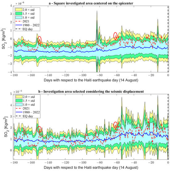 Sulphur dioxide (SO2) investigation in the six months before the Haiti 2021 earthquake (vertical dashed black line) using (a) a symmetric square area centred on the epicentre or (b) a rectangular area around the seismic displacement. The years 1982, 1991, 1992, 2003 (only a) and 2006 (only b) have been excluded for outlier values. Red circles underline anomalies.
