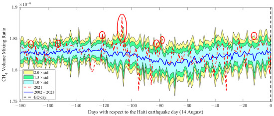 Methane (CH4) investigation in the six months before the Haiti 2021 earthquake (vertical dashed black line). The data source is the AISR instrument, so the background has been calculated over a shorter period (from 2002 to 2023, excluding the earthquake year 2021). Red circles underline anomalies.