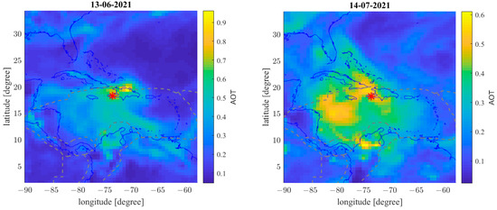 Figure 12 shows a couple of maps of two anomalous days for aerosol content: 13 June and 14 July 2021. In the first map, the aerosol concentration is quite close and unique to the epicentre; overall, it is aligned with the main plate boundary. This supports a possible release of some substances, such as radon, from the active fault due to increased stress from the impending earthquake. On the second map on 14 July 2021, aerosol concentration is not unique to the epicentre, so some doubt exists about a possible link with seismic activity. It cannot be excluded that more phenomena coexist at the same time. For example, the large concentration in Colombia/Venezuela was surely not due to the preparation phase of the Haiti earthquake. However, it seems clear that South American aerosol emissions are a separate phenomenon from the concentration in the Caribbean Sea. Consequently, considering the close-to-epicentre aerosol concentration as a possible pre-earthquake phenomenon cannot be wholly excluded or confirmed.