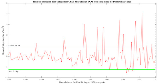 Time series of CSES-01 Ne night-time values (red dot/line) acquired in the Dobrovolsky’s area in the six months before the Mw = 7.2 Haiti 2021 earthquake (vertical dashed black line). Green lines indicate thresholds to define anomalies based on median (m) and interquartile range (Iqr).