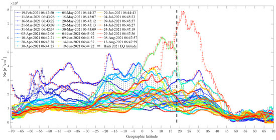 Another analysis with CSES-01 Ne nighttime data is presented in Figure 14. In this case, only one orbit is selected, and its values are characterised in geomagnetic quiet conditions, and eventual outliers (marked as red crosses) are extracted. To select the most probable anomalies that may be related to the preparation for the earthquake, I focused on the latitude of the earthquake. The other part of the profile can be used as a comparison to see if the phenomena are local or affect the entire orbit, making it less likely to be associated with seismic activity. The most anomalous increase in electron density occurred on 29 July 2021, 16 days before the mainshock. The peak is slightly North of the incoming epicentre, well inside the Dobrovoslky’s area. Another important increase in electron density occurred on 4 June 2021, 71 days before the Mw = 7.2 Haiti 2021 earthquake. It is worth noting that almost at the same time, the seismic trend accelerates, supporting a possible coupling between the lithosphere and the ionosphere. The corresponding analysis with CSES-01 Ne daytime data is reported in Appendix B.