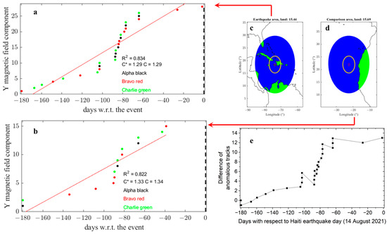 The Swarm magnetic Y-East component has been objectively analysed in the area of a 3.32° radius around the epicentre, according to a previous study [86]. All the tracks that have at least one 3° latitude window with a root mean square (rms) greater or equal to 3.5 times the rms of the whole track (between −50° and +50° geomagnetic latitude) are counted as anomalous, and their cumulative trend is shown in Figure 15a. The same approach was applied to a comparison area shown in Figure 15d centred at a longitude of 22.5° W and the same magnetic latitude of the epicentre, obtaining the cumulative trend plotted in Figure 15b. Finally, the difference between the two trends has been estimated in Figure 15e. Whenever such a trend is positively increasing, it means that in the epicentral area, more anomalies are recorded than in the comparison area. Especially 80 days before the Mw = 7.2 Haiti 2021 earthquake, a higher rate of anomalous tracks were recorded in the epicentral area. However, at this time, the trend also increased in the comparison area. A combination of a global geomagnetic phenomenon that interacted with an altered electromagnetic field at the epicentral area cannot be excluded, for example, due to the release of positive charges (p-holes) for the increase of the seismic stress as proposed by Freund [94,95].