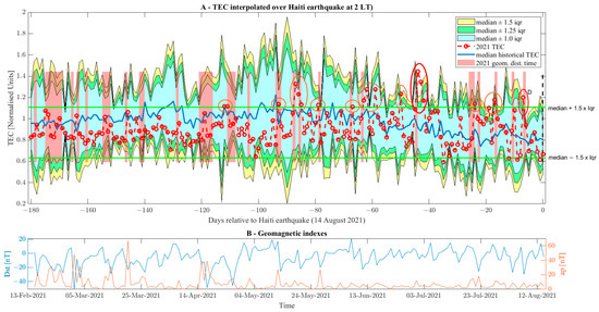 (A)Time series of the Total Electron Content (TEC) residuals estimated from the Global Ionospheric Maps of Total Electron Content (GIM-TEC) maps and interpolated above the earthquake epicentre and at 2 LT. The green horizontal lines indicate thresholds for anomalous values in the year of the earthquake (2021). (B) Geomagnetic activity represented by Dst (blue line) and ap (orange line) indexes.