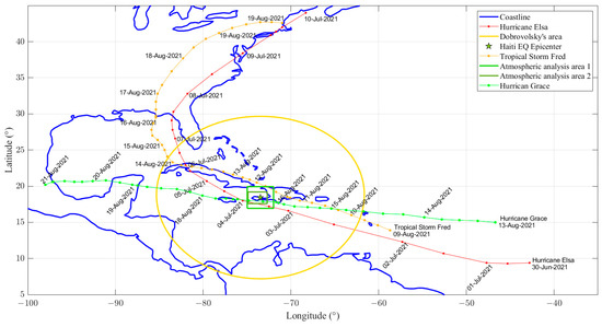 Map of positions of Elsa and Grace hurricanes and Tropical Storm Fred that crossed the investigated area during the six months before the Haiti 2021 earthquake occurrence. The yellow circle represents the Dobrovolsky’s area and the green boxes shows the atmospheric research areas implemented in MEANS algorithm for this earthquake.