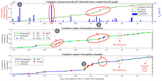 The investigation of the cumulate of released strain underlined a trend variation 66 days before the mainshock (x0 parameter of sigmoidal fit). This means that from a tectonic point of view, Dobrovolsky’s area experienced higher seismicity about two months before the Haiti 2021 earthquake. In addition, the ES parameter defined by Hattori [23,89] has been estimated and reported in Figure 6. The cited papers considered the region as active when ES ≥ 108. This occurred twice: 171 and 130 days before the Mw = 7.2 Haiti 2021 earthquake.